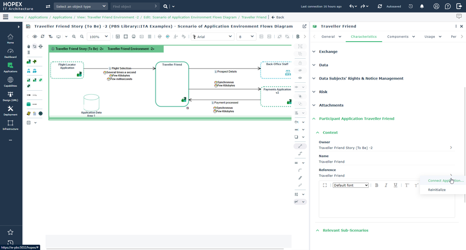 Important note : we just discovered a bug in the duplication process for the scenario of flows: the subject (application in the center of environment) is not replaced by duplicated application (the source application is still used) in the new diagrams created. Before we deliver the fix, you will need to manually replace the object (open property page and in characteristics page, "participant" section, connect the new application).